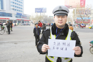 | 高超峰是一名交警,在周口市区七一路执勤。每天交通保持畅通,自己身体健康是他新年里的心愿。