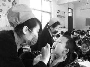 本报讯 “孩子们,张开嘴巴,让阿姨看一看你们的牙齿有没有蛀牙。”1月6日下午,在周口六一路小学二年级教室,周口口腔医院的医护人员在为孩子进行口腔健康检查(如图),并向孩子发放《实施窝沟封闭预防儿童龋齿家长知情同意书》。