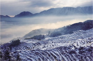 黄庵垴位于山西昔阳县皋落镇,处晋冀分水岭,海拔1774米,山下便是北岩村,一个地道的晋中小村,宁静美丽。当雪花飘洒,莽莽太行银装素裹,阳光下,壁立千仞的山岩,闪闪发亮;层层梯田仿佛似山的裙摆;攀援而上的山路则如长龙蜿蜒,静静的冰河贯穿整个山谷,沿途你可看到形态各异的冰笋、冰凌、冰花、冰瀑,星罗棋布,可谓鬼斧神工。山涧间大大小小的瀑布,结成的冰挂,似水晶项链一般,有的宛若盛开的莲花,有的像佛塔,或冲天利剑。巨型冰挂之下,哗哗的流水从薄冰层下穿出,充满盎然生气。