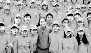 1月7日,李娜(中)和来自中国的球童们合影。当日,中国球员李娜来到墨尔本公园和即将在2014年澳网工作的380名球童一起进行年度拍照活动。