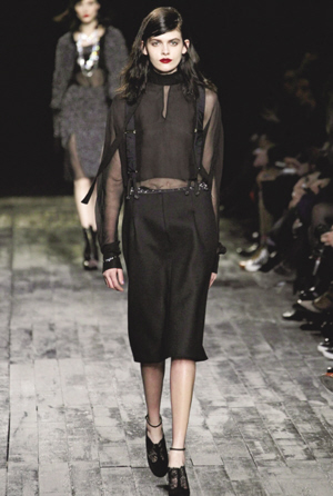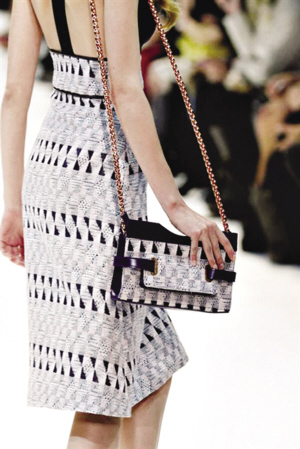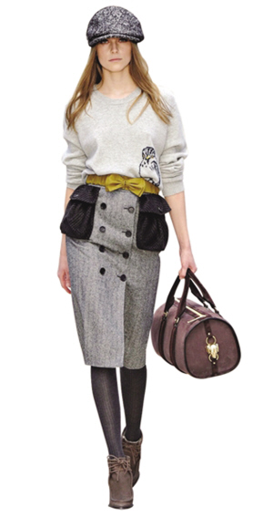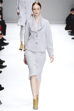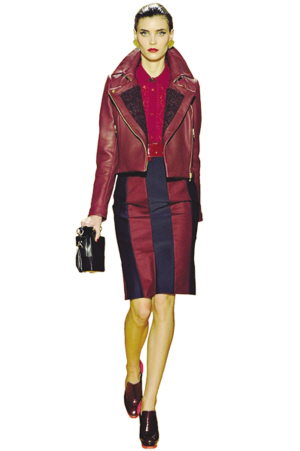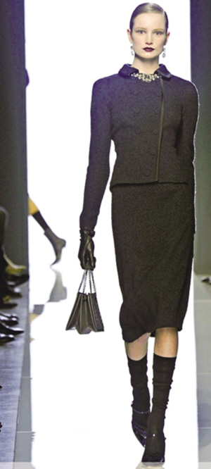 现今时尚似乎已经习惯了过短或过长的裙子,让裸露的双腿高调招摇过市或躲在及踝裙摆中烟视媚行,于是当此季长及膝盖上下、裙身狭窄的半身裙大量涌现,人们总算回忆起某个时代我们持有的“中正”格调。只需搭配一双简洁的高跟鞋,便足以让秀丽的小腿低调地绽放致命诱惑。当然,此时的高腰及膝半身裙所呈现的姿态,和80年代与大宽肩上衣成固定搭配的“大女人”又是大相径庭了。(陈晓)