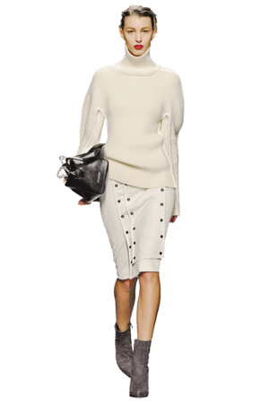 骑士风格的及膝窄裙,有着偏位的缝合线,大面积的相同面料拼贴,三排具有金属质感的纽扣使乳白色的裙面瞬间充满活力。