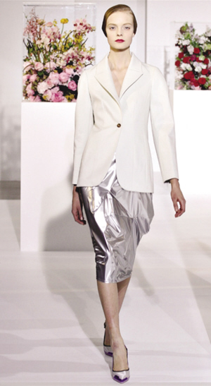 银色反光材质与不对称的三维剪裁使最具传统味道的款式也变得充满未来感。这样的出位单品,只需配以简约大方的上衣与高跟鞋便足够扎眼。