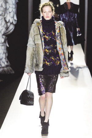 波浪纹路与多种色彩铺陈于窄小裙摆,柔滑面料带来波光粼粼的感觉,与风格粗犷的毛衣、皮草外套相搭配有一种充满矛盾的微妙美感。