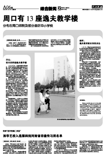 除了大家知道的周口师范学院逸夫艺术楼外,1月8日,记者还从市教育局获悉,在周口各县区的中小学内还落户有12个邵逸夫工程项目。这些教学楼共同见证着邵逸夫在周口曾留下的印记。