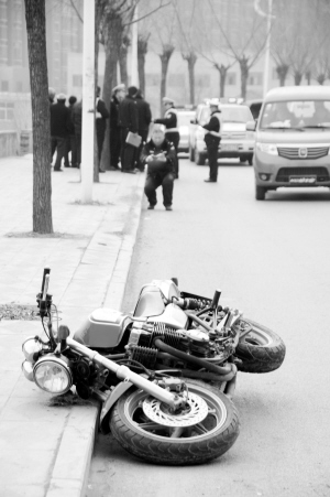当日15时30分许,记者来到位于文化小学北侧的滨河路上的事发现场,只见一辆摩托车歪倒在南侧道牙上,距摩托车十多米远处的一个灯杆旁遗留着一片血迹,没有见到事故其他车辆和伤者。记者在距离摩托车西侧20米左右的地方,发现了明显的刹车痕迹,道牙上还有划痕。