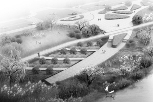 然后,因地制宜传承地域文化:重点展现曲艺文化,通过“渔鼓道情”景点展现周口非物质文化遗产“太康道情”戏曲艺术,保留周口货运老码头,再现周口河运文化,沙颖安澜一景再现周口风俗文化;以人为本设计宜居场所:无论是从设计上还是从施工工艺上都体现“人”的主题性,如亲水栈道、空中走廊、皮划艇港湾、水榭廊桥的设置安放,道路软硬性铺装的有机结合,实现水陆空立体交通;植物造景发挥生态效益:在整个设计过程中保护沙颍河现有地形、植被,强化驳岸的生态自然化,提高绿化面积;绿色设计弘扬生态文明:铁路桥陆地部分的保留,结合周边绿地形成贯穿东新区的一条绿色廊道,并纳入城市绿网系统,真正实现将城市融于自然。