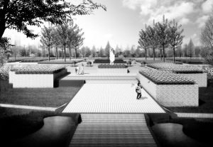 琴音台:该景点周边多为商业,人流量大,入口布置树阵和平行通道结合形成多入口的形式方便人们随时进入绿地。主题雕塑形似“笙”,演绎“女娲制乐”的传说;