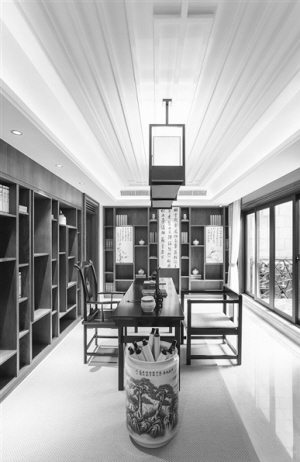 比如以明式清秀雅致的线条发散开去,便有了这样一个精简而不失严谨,多变又不失风骨的书房设计。直线条的使用不仅仅是大的家具,比如桌椅、书柜、门窗等,还有小的装饰,比如门框的纹饰设计,书柜的区间分隔等,连落地灯也以长短不一的线条组合,韵味十足。