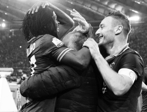当地时间1月21日,罗马队球员热尔维尼奥(左一)在比赛中庆祝进球。