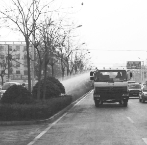 连日来天气干燥少雨,让周口市区绿化带集体“喊渴”。为保证中心城区内绿化植物生长不受影响,园林部门充分发挥职能作用,积极做好抗旱保苗工作,确保苗木健康生长。图为园林工人在黄河路浇灌绿化带 。晚报记者 张擘 摄