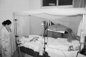 记者在医院4楼的重症监护病房看到,两个孩子脚对脚躺在一张悬浮床上,男孩手、脚、腹部伤势严重;女孩儿右脸、双手、右脚部分被烧焦,全身多处烧伤。屋内很静,只有医护人员寸步不离地照看着,两个监护仪上的数字不停闪烁(如图)。