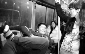 视频刚开始不久,就出现几位“手机控”的年轻人,正在低头摆弄手机,看到一位长者到来后,这些年轻人视若无睹,连个招呼都不打,“爱心天使”出现后,对这几位年轻人行为进行了教育;在公交车上,一位年轻的小伙子独自“霸占”三个座位,看到一名孕妇站在身旁,却视若无睹(如图),“爱心天使”的出现,让这位小伙子拥有了爱心。