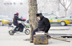 一箱、一凳、一棍,一老人独坐在市区中州大道和七一路交叉口假寐,周边嘈杂的环境似乎一点儿也没有影响到他。