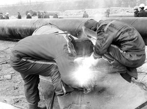 28日中午,记者在“穿越工程”施工现场看到,虽然天气寒冷,可施工现场依然热情高涨。沙颍河北岸,定向钻机机器轰鸣;沙颍河南岸,输水管道正在紧张地焊接中(如图)。该项目总工喻金钟介绍,目前,“穿越工程”马上进入最后一道扩孔程序,因已进入关键阶段,即使大年初一也不能停工,如果停工,有可能会造成孔道塌陷,延误工期。