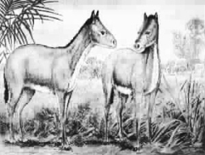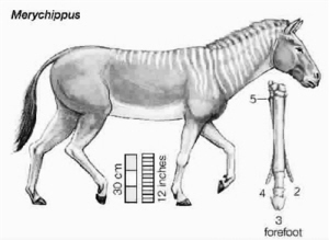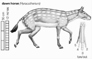 6500万年前,陨石撞击地球,结束了恐龙统治地球的时代。躲在地洞里的哺乳动物幸免于难,开始了新的进化历程。从那以后的几百万年时间里,哺乳动物在地球上逐渐繁盛。6000万年前,马类的原始祖先原蹄兽出现了。这些古老的动物体型较大,体长1.2米,但是还没有它们后代那样的速度和力量,四肢短而笨重,行走缓慢,常在森林或热带平原上活动,以植物为食。