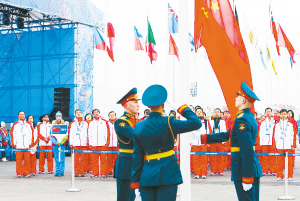 随着4位身穿俄罗斯传统服装的姑娘敲击出激昂的鼓点,中国索契冬奥代表团和立陶宛冬奥代表团一起在奥运村升旗广场举行了升旗仪式。仪式上,俄罗斯艺人用热情的歌舞表达了索契冬奥会对每位参与者的良好祝愿,俄罗斯著名女子撑竿跳名将伊辛巴耶娃作为海滨场馆区奥运村的村长,将一个俄罗斯套娃赠送给了中国代表团,而中国代表团副团长肖天则以一个中国青花瓷盘回赠。