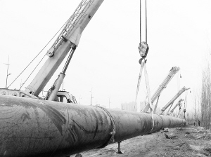 当日11时许,记者在施工现场看到:沙颍河北岸,定向钻机轰鸣着,吃力地把“穿沙工程”首条输水管道一点一点地从沙颍河南岸向北岸回拖,该管道位于河底以下10多米处;沙颍河南岸,4台起重质量高达80吨的起重机也在怒吼着,它们等距离分布,呈一字形排开,同时把焊接好的内径1米的输水管道靠近河岸的一端吊起(如图),使管道稍微离开地面,减少和地面的摩擦,协助定向钻机回拖。