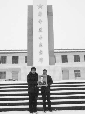 下图:郑春光的家人抱着其遗像在淮阳县烈士陵园
