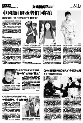 内地版《继承者们》在广电总局的备案资料近日也被曝光。据透露,该剧名为《亿万继承人》,主要讲述杨喜旺某一天被失散了22年的爷爷找到。原来,他的爷爷竟是环球制衣董事长岳广福,爷爷在遗嘱里要求杨喜旺和自己同父异母的兄弟,通过三场时装秀的比拼,用实力赢得企业继承人的位置。