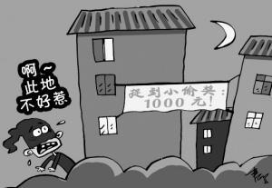 抓住小偷,奖励1000元!最近两个月,南京栖霞区胜利三村小区门口出现了这样一条横幅。“全民抓小偷,这个有意思。”“也许是吓唬小偷的,叫他们不敢来。”自从横幅挂出来之后,就成了附近居民经常议论的话题。你别说,这个办法还真不错,小偷明显变少了。