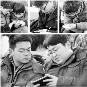 2月13日,在周口客运中心站候车室,旅客在忙碌着低头使用手机(拼版图片)。春运里候车室少了以往的喧嚣声,多了埋头苦干的“手机控一族”, 刷微信、看新闻、玩游戏等。