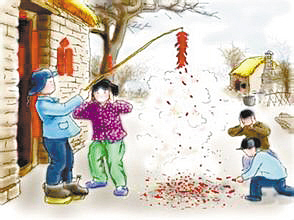 最让人心生感慨的,是那时的拾炮。现在春节放爆竹落下的“弱捻”炮,儿童们连看一眼都不看,从上面踏过去。而那时作为小孩子子,我们是不惜冒着被炸伤的危险挨家跑着拾它的。因为没钱买炮,只有去拾弱捻炮,拾回来重新栽上捻子放,或掰成两截“燃大花”。与其说是拾炮,不如说抢,因为拾炮的小伙伴们成群结队,若不去抢那落下的炮,根本拾不到。拾炮时,从这家,到那家,从村东头,到村西头,一路跑过去,因天未亮,看不清路,往往被“扑通”一声绊倒。那时,有手电筒的人家很少。有一次,二叔把他的手电筒借给我,让我去拾炮,于是,我如鱼得水。谁家放炮时,用一根长棍举着,点燃后,噼里啪啦,震耳欲聋。下面的孩子们争着上前,你推我搡,有时砸成一堆,倒在下面的被压得嗷嗷直叫,而在上面的,则被落下的炮炸得直叫。到天明以后,小伙伴们你看看我,我看看你,都禁不住笑了,因为有的帽子被烧成了一个大窟窿,有的手指被炸肿了,有的被炮药弄了个花脸,但一比“战利品”,大家还是满心欢喜,因为口袋里都是满满的弱捻炮。