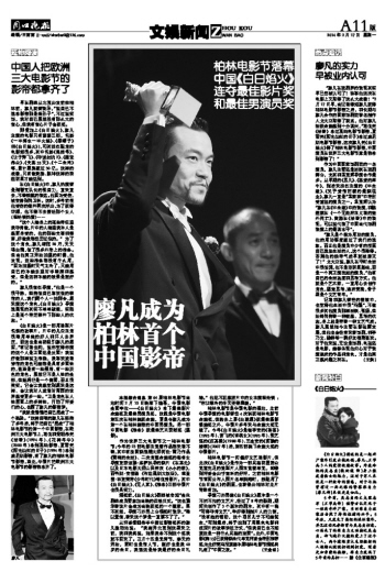 “廖凡在戏剧界的表现其实早已经被认可了!恭喜他这次在电影上又取得了这么大成绩!”2月17日早,当记者得知廖凡获得柏林电影节影帝之后,和长期与廖凡合作的国家话剧院著名制作人戈大立取得了联系,他对廖凡斩获金熊感到十分高兴,“葛优凭《活着》拿过戛纳电影节影帝,夏雨凭《阳光灿烂的日子》拿过威尼斯电影节影帝,这次廖凡凭《白日焰火》得了柏林电影节影帝,中国演员在世界三大电影节算是都拿到影帝了!”