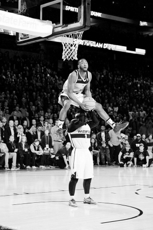沃尔决赛时最后一扣让他锁定了胜局,他让一壮汉扮成吉祥物,双手持球到头顶。沃尔助跑之后从他头顶跨过,同时接球篮球,反手扣篮。