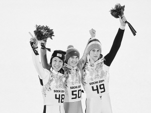 当地时间2月15日,冠军波兰选手施托赫(中)、亚军日本选手葛西纪明(左)和季军斯洛文尼亚选手普莱维克在献花仪式上。当日,在2014年索契冬奥会跳台滑雪男子个人大跳台决赛中,波兰选手施托赫以278.7分的成绩夺得冠军。