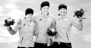 当地时间2月16日,荷兰选手在短道速滑女子1500米决赛中包揽冠亚季军,冠军乔瑞安(中)、亚军伊琳(左)和季军洛特在献花仪式上合影。