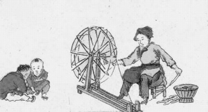 奶奶用过的一架纺车是从我记事起就很破旧的纺车,是发黄水前留下来的,因年代久了,部分器件木料已经糟了,几根木翅有的已经断裂,绑着个木片继续使用,摇把的轴已经磨细了,轴筒已被磨得很大,摇时就有些晃荡。纺车轮子带动锭子的线是弦绳,尽管很结实,但用得时间长了也会断,经常是磨断了接一下再用,实在不行了才更换新的。线是在锭子上绾绕起来带动锭子转的,锭子与固定它的铁条钩磨损得也很厉害,铁条钩磨断了再更换,而一根锭子能用好几年。