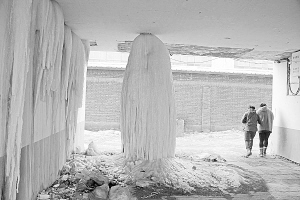 2月18日,吉林省吉林市,徐州路和清源街交会附近的徐州路17号楼,紧邻街道的一个长约8米,宽约5米,高约3米的门洞内有一个直径约1米的大冰柱。