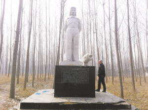 15时许,记者来到和王沟桥村搭界的商水县东城办事处苏坡行政村西头的一片林地里,只见用汉白玉制成的高志航雕像巍然屹立在林地中间(如图),从路上通往雕像修有专门的水泥路。该村92岁的村民苏山东说,他也亲眼目睹了日机被击落的瞬间,“当时我们能听到日机降落时,日本军人叽里哇啦的惨叫声。”该村现年95岁的村民苏多云说:“高志航是好样的,我们要永远纪念他。”