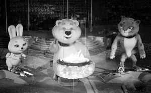 索契冬奥会吉祥物小熊(中)在闭幕式上吹熄圣火