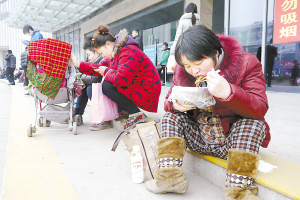 在周口市中心医院门前看到她时,已经接近中午,她正坐在医院门前的台阶上,端着一个套了一层白色塑料袋的不锈钢碗,大口大口地吃着热干面。