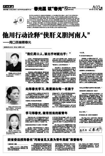 团省委追授郑春光“河南省见义勇为青年英雄”荣誉称号