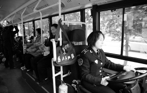 西安“雷锋公交车队”k46路公交车上挂着印有“学雷锋 为人民服务”的挎包,挎包里有针线包、药品等,供乘客免费使用(3月3日摄)。