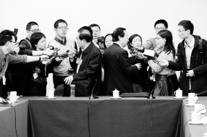 3月4日,在北京铁道大厦,记者们在小组讨论后将全国政协委员李毅中(右)和杨凯生围住,进行采访。(新华社)