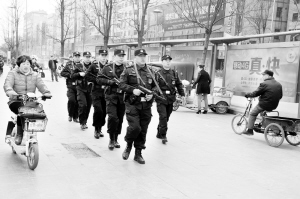 3月4日,在周口市区七一路上,一队全副武装的特警在巡逻。据了解,自3月1日晚昆明火车站发生暴力恐怖袭击事件后,车站及人员集中场所的安保问题引发世人关注。周口市公安局党委研究决定,从即日起,除我市公安机关坚持日常街面巡逻外,特警、武警以及协警等社会力量,会分不同时段在人员密集场所坚持巡逻防控。