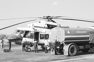 3月9日,海军技术人员为参与搜救马航失联客机的直升机加油。
