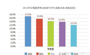 近日,奥维咨询(AVC)2013年度彩电行业市场销售数据新鲜出炉,数据显示,以创维为首的六家行业巨头销量市场份额达78.2%,合资品牌份额13%,年初呼声不断的互联网新进企业占比甚微。根据奥维咨询(AVC)2013年的年度数据显示,2013年彩电市场国内零售总量为4781万台,同比增长12.7%,液晶电视占比超过95%。其中,创维彩电销量为812万台,市场占有率高达17.0%,再次蝉联彩电销量冠军,也成为彩电历史上自然年度国内市场销量首个突破800万台大关的品牌。至此,创维已连续8年夺得彩电销量冠军,领军行业。海信以15.6%位居第二,TCL、长虹、康佳分别以14.3%、13.9%、12.1%进入第一阵营。