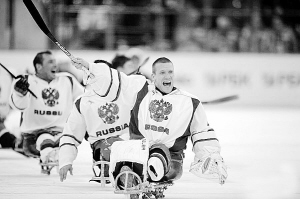当地时间3月11日,俄罗斯队球员庆祝胜利。当日,在索契冬季残疾人奥运会坐式冰球小组赛B组的比赛中,俄罗斯队以2∶1战胜美国队。