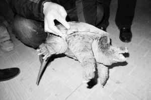 当日上午,记者看到了这只乌龟,只见它浑身暗绿色,个头很大,拖着一个长长的尾巴(如图)。记者将乌龟的体貌特征向秦应来作了一番描述后,秦应来说:“根据你的描述,我初步断定这只乌龟是只普通观赏龟,也称巴西龟,它不是国家级保护动物,只不过个头大了点,村民不用神化这只乌龟。出现此类龟有两种可能,一种是市民放生所致,一种是市民自己购买巴西龟用于观赏,不料乌龟却从家中溜走。此种乌龟长这么大根本不稀奇,因为它们的生存能力和适应能力很强。”线索提供 张玉民