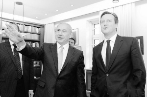 当地时间3月12日,以色列总理内塔尼亚胡(中)在耶路撒冷会见英国首相卡梅伦(右)。当日,以色列总理内塔尼亚胡与英国首相卡梅伦在位于耶路撒冷的以色列总理办公室举行会见,就推动巴以和平进程等问题交换意见。这是卡梅伦上任以来首次访问以色列。