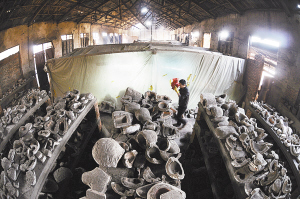 首先,要选土。选土是很有讲究的,一般都是选红粘土。然后洗土,充分揉搓均匀后,沉淀,这样做出的泥胎才能细腻经雕琢。接下来,需要工艺师按照要求用泥做出初型,将初型的外面用石膏包住,再做成蜡件。用砂和石膏将蜡件包起来,集中摆放加温脱蜡,形成石膏空腔。然后浇铸融化好的铜汁,做出青铜毛坯,再经整修、抛光、做旧,一件精美的青铜器就展现在眼前了。