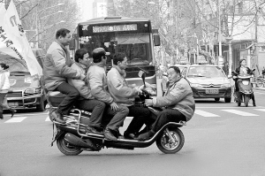 3月16日上午,常德城区青年路与人民路交叉路口,五名男子挤在一辆电动车上,表演马路“杂技”。陈自德 摄