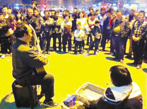 华灯初上的十字街头,男人抱着吉他,神情专注;女人唱歌,歌声哀婉。一会儿,女人好像累了,歇息一下,男人接着唱。路过的人,有的侧过脸来,带着欣喜的神情;有的停下来,扔过去一块儿硬币。有个小女孩从妈妈的电动车后座上跳下来,跟妈妈要了一块钱也跑到他们面前。的确,我相信那一瞬间,他们发自心灵的生命之歌、渴望之歌,感动了所有走过的人们。是他们在那一瞬间将怀着不同心绪的人们的情感聚合在一个点上,那个点,是温馨,是爱意,是一瞬间的纯净。祝福他们,世界这个大舞台,是属于他们的。万高鹏 文/图