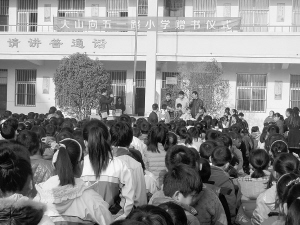 为回馈社会,增强小学生的诵读能力和口算能力,近日,大山教育集团周口分校员工来到市五一路小学,向该校捐赠了4000多册《书香伴童年》读物和《口算天天练》练习册,受到了全校师生的热烈欢迎。记者 刘华志 摄