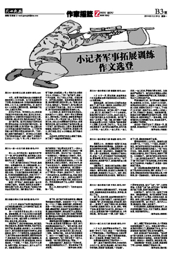 军姿训练好之后,我们开始练习翻越障碍、匍匐前进、CS对抗。在进行CS对抗时,我开始的任务是守山,拿着枪,对着攻上来的敌人扫射,但最终只消灭了一个敌人。下午进行CS对抗时,我进行攻山,结果山上的敌人杀下来,打得我们一败涂地。快结束的时候,教练命令我们翻越两米多高的毕业墙,看到墙那么高,我真的害怕了,一直往后退。但是看到别的小记者都翻了过去,我也鼓足勇气,成功翻过了那面墙。